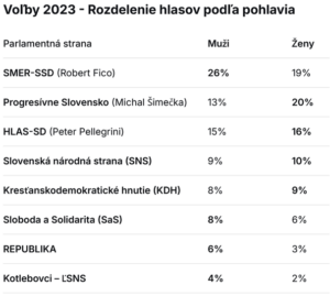 Významný podiel žien podporili stranu, ktorá je vojno-štváčskou – PS, pričom pri oveľa menších rozdieloch tieto vojno-štváčske strany by mohli zostaviť vládu a poslať mužov – Slovákov do vojny na Ukrajine. Ak by vojna na Ukrajine aj naďalej trvala do nasledujúcich volieb a podarilo by sa vyskladať vojno-štváčsku vládu PS+Demokrati+, tak by jednoznačne mohlo hroziť, že 7 percentný rozdiel pri PS medzi voľbou mužov a žien pri PS by celkovo mohlo znamenať v určitom prípade 6-7 poslancov vojno-štváčov, ktorí by sa dostali do parlamentu navyše. Dajte si to do súvisu, že PS má 32 poslancov, pričom ženy – 20% a muži 13% z tabuľky. Pripomeniem, že súčasná koalícia má väčšinu 4 hlasov, takže sa nejedná o nič nevýznamné, pričom táto “maličkosť” môže znamenať úplný politický prevrat v prospech vojno-štváčov